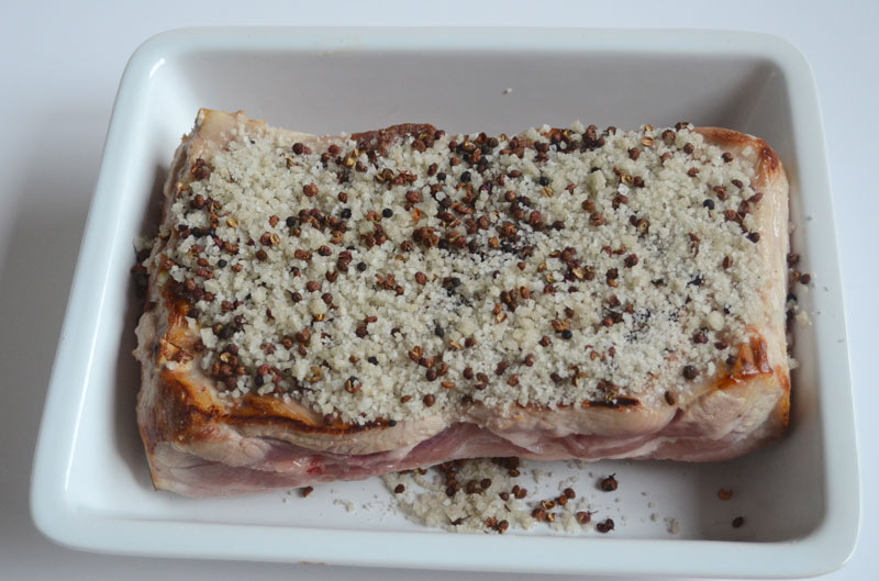 La veille, mélangez le gros sel et le poivre. Versez un tiers de ce mélange dans un plat pouvant contenir la viande et posez la poitrine dessus.