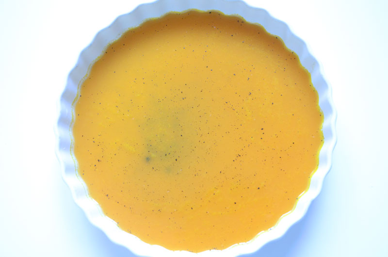 Faites chauffez le jus d’orange avec la vanille. Essorez les feuilles de gélatine entre vos doigts et faites les fondre dans le jus chaud. Mélangez bien et renversez dans le fond d’un moule à tarte. Laissez prendre la gelée au réfrigérateur.