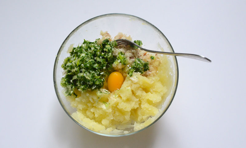 Egouttez les pommes de terre et placez les dans un saladier, écrasez les à l’aide d’une fourchette, faites de même avec le poisson et ajoutez le dans le saladier.