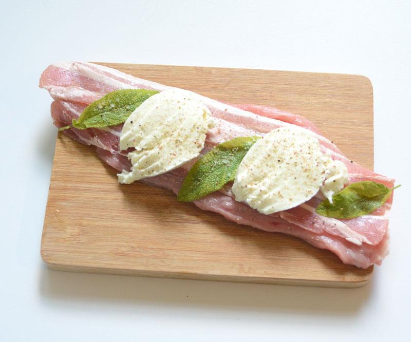 Etalez sur sa surface deux tranches de lard et posez deux ou trois tranches de mozzarella et deux feuilles de sauge. Salez et poivrez.