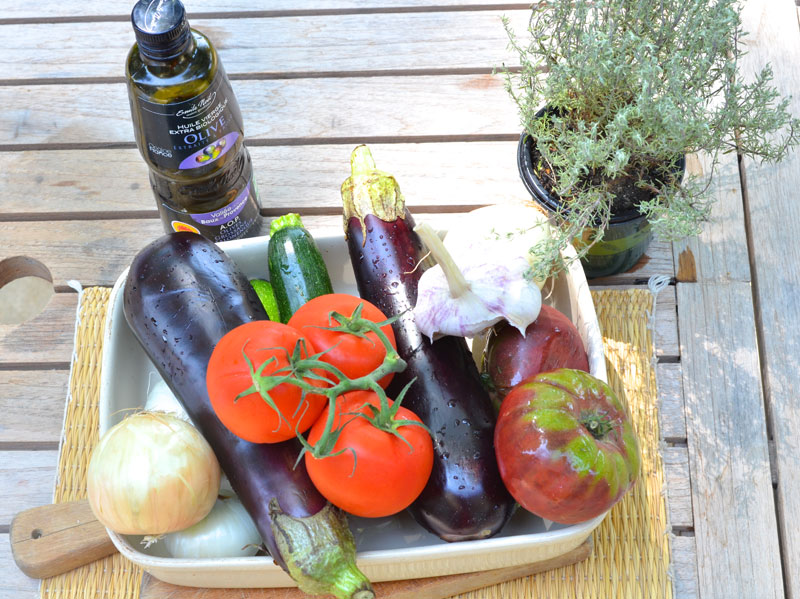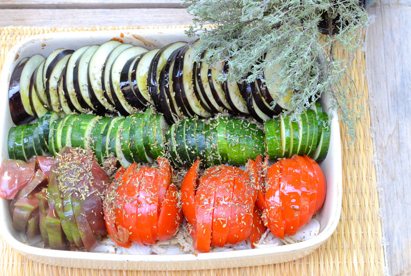 Disposez sur les oignons et l’ail, une ligne d’aubergines en serrant bien les rondelles de légumes, puis faites de même avec les tomates et les courgettes. Arrosez le tout avec l’huile restante, émiettez le thym, salez et poivrez. Enfournez à nouveau et laissez cuire une bonne heure ou plus en surveillant. Si les légumes dorent trop, couvrez le plat avec une feuille de papier aluminium.