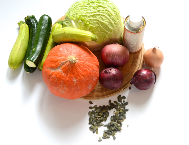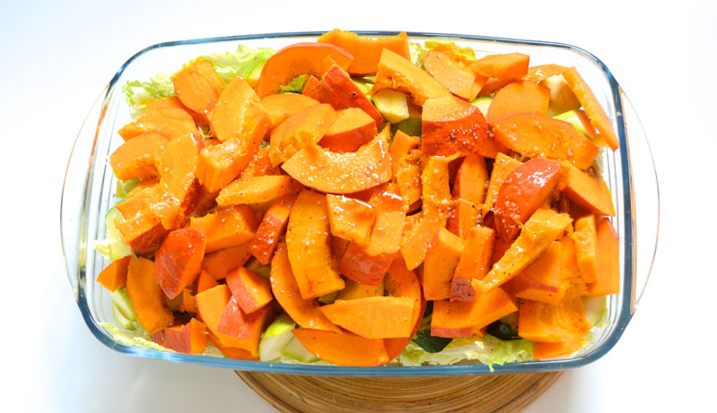 Mettez les oignons et le chou dans le moule, puis les courgettes et enfin le potimarron.