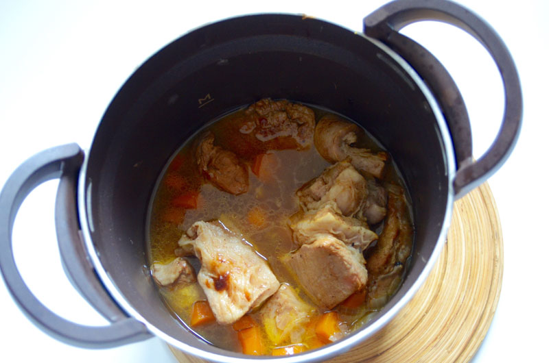 Couvrez et poursuivez la cuisson environ 50 min jusqu’à ce que l’ensemble soit bien fondant. Au besoin, rajoutez un peu d’eau si besoin.