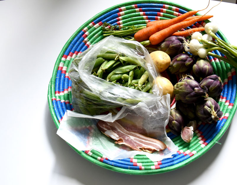 Cherchez bien, il reste encore des petits pois frais au marché et les artichauts poivrade reviennent nous régaler. Un petit gout de Sud dans cette recette à servir en entrée, en accompagnement ou en plat principal selon votre faim.